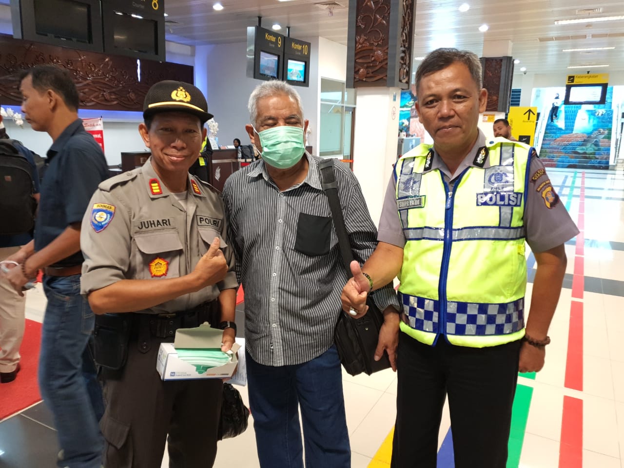 “Kami melakukan pembagian masker untuk antisipasi penyebaran virus Corona, serta melakukan pengecekan kesehatan kepada para penumpang baik yang datang maupun yang akan berangkat,” ujar Juhari