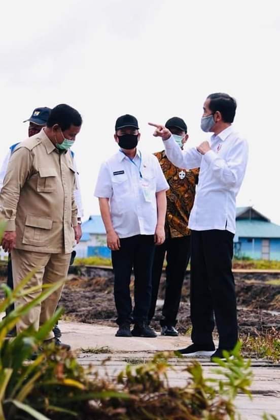 Tampak berjalan santai Presiden dengan menggunakan kemeja putih dan masker berjalan perlahan bersama sejumlah menteri menuju lokasi Food Estate sembari mendengarkan penjelasan singkat dari Menteri Pertanian, Menteri PUPR dan Bupati Kapuas Ben Brahim S Bahat berkaitan dengan lahan yang akan dikerjakan sebagai proyek pangan nasional.