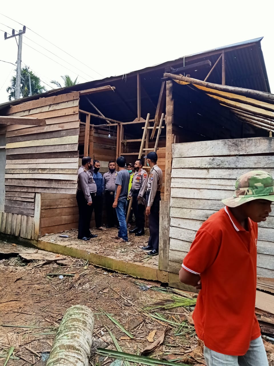 AKP Amirwan, SH mengatakan, setelah menerima laporan saya bersama Kanit Binmas, Kanit Intel dan anggota langsung ke TKP dan bersama warga bergotong royong membersihkan pohon kelapa tersebut. Pada kesempatan ini saya juga memberikan bantuan kepada korban berupa beras 2 karung dan atap sebanyak 15 lembar serta kayu untuk merenovasi rumah korban agar bisa ditempati kembali.