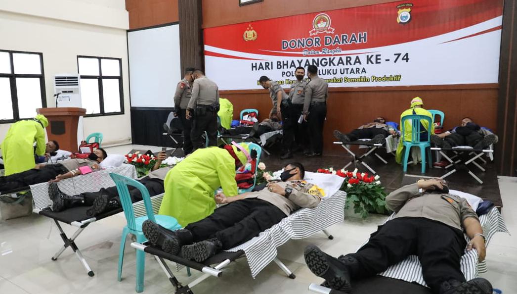 TERNATE, mediapolisi.com – Dalam rangka memperingati HUT Bhayangkara Ke-74, dengan tema “Kamtibmas Kondusif Masyarakat Semakin Produktif”, Polda Malut dan pengurus daerah Bhayangkari Maluku Utara menggelar bakti kesehatan berupa donor darah di Aula Mapolda Maluku Utara, Selasa (23/6/2020)