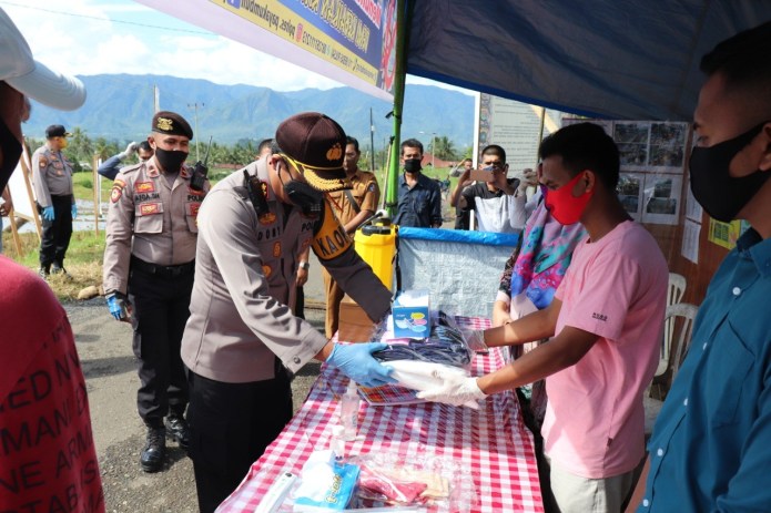 Kapolres memberikan bantuan APD dan tali asih kepada relawan posko mandiri Covid-19.