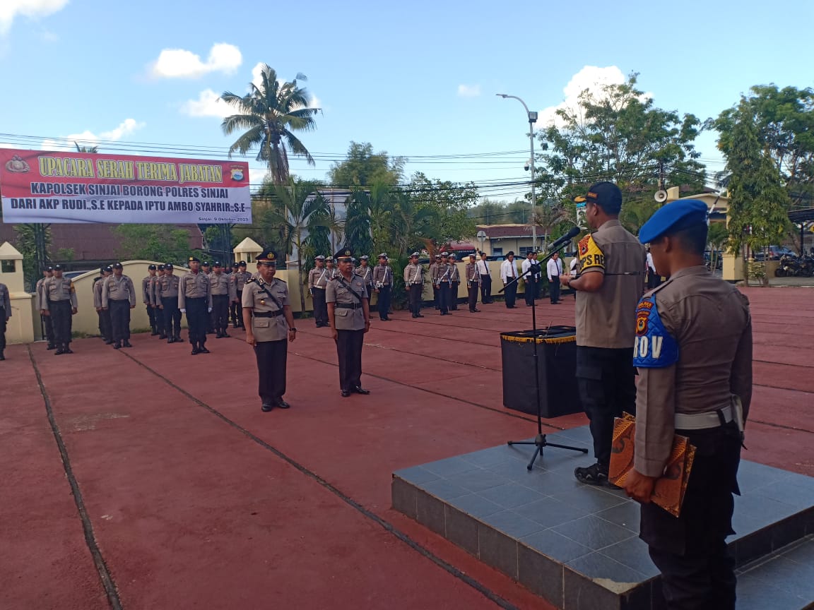 Sinjai, mediapolisi.com – Bertempat dihalaman Mapolres Sinjai, Kepala Kepolisian Resor Sinjai Ajun Komisaris Besar Polisi AKBP Sebpril Sesa, S.Ik pimpin upacara serah terima jabatan Kapolsek Sinjai Borong, yang juga dihadiri oleh Ketua Bhayangkari Cabang Sinjai Ny. Yovita Sebpril Sesa, Wakapolres Sinjai Kompol Sarifuddin, S.Sos, para Kabag, Kasat, Kapolsek, perwira staf dan Bhayangkari serta personel Polres Sinjai sebagai peserta upacara. Rabu pagi (09/10/2019).