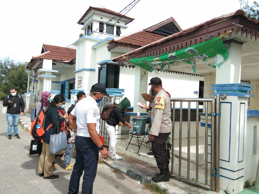 Jakarta – Petugas Gabungan Tiga Pilar Kelurahan Pulau Pari selalu menerapkan protokol kesehatan kepada warga masyarakat yang baru tiba di pelabuhan kedatangan di Pulau Lancang Kelurahan Pulau Pari Kecamatan Kepulauan Seribu Selatan, Selasa (29/12/2020).