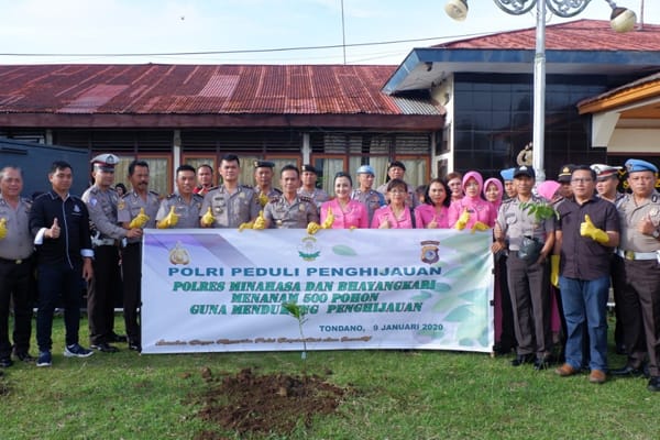 TONDANO, mediapolisi.com – Polres Minahasa bersama Bhayangkari melaksanakan penanamam pohon sebanyak 500 bibit, di sekitar halaman Mapolres, Kamis (9/1/2020) pagi.