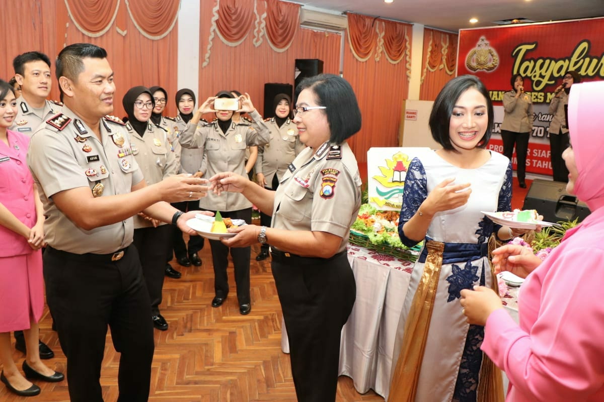 Setelah sambutan dilanjutkan dengan pemotongan tumpeng dan kue tart oleh Kapolres yang didampingi ketua Bhayangkari Susi Asfuri.Potongan tumpeng pertama diserahkan oleh Kapolres kepada anggota Polwan tertua Ipda Adriana A.Matapere yang menjabat PAMA bagian Sumda Polres Malang kota.Ipda Adriana sendiri akan menjalani masa purna bhakti.