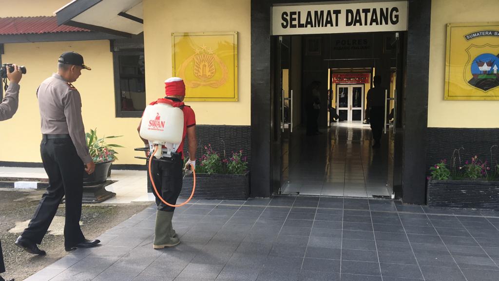 Personil Polres Padang Panjang melakukan penyemporatan disinfektan keseluruh ruangan kerja dan pelayan Polres setempat, Rabu (18/03).
