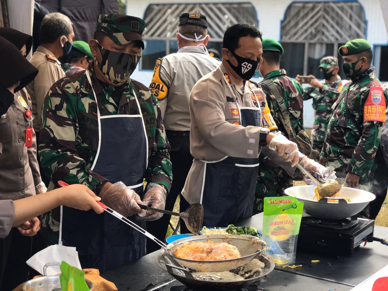 Kapolres Solsel bersama Danramil Sangir sedang memasak di dapur umum dalam rangka persiapan PSBB.(Ist)