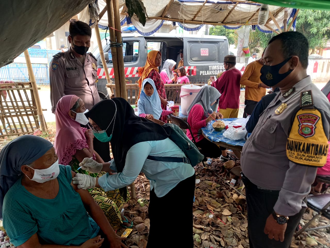 Bekasi – Guna menekan angka penyebaran Covid-19 dan mempercepat pemberian vaksin, diwilayah hukum Polsek Tambelang Polres Metro Bekasi,menggelar vaksinasi secara door to door kepada masyarakat umum di wilayah Desa Sukawangi Kecamatan Sukawangi Kabupaten Bekasi.Jumat ( 15/10/2021).