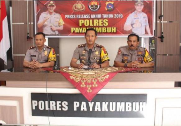 Kapolres Payakumbuh AKBP Dony Setiawan, S.I.K., M.H., didampingi Wakapolres Kompol Arie dan Kabag Ops Kompol Basrial mengumumkan adanya penurunan angka kejahatan sebesar 183 kasus atau 22% pada tahun 2019 dibanding dengan tahun 2018.