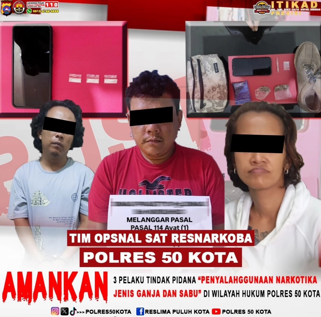 Lima Puluh Kota, Jumat, 16 Mei 2025–Satuan Reserse Narkoba (Satresnarkoba) Polres 50 Kota kembali menunjukkan komitmennya dalam memberantas peredaran narkotika di wilayah hukumnya. Dalam satu malam, petugas berhasil mengungkap satu kasus penyalahgunaan narkotika jenis sabu dan ganja di wilayah Kecamatan Harau, Kabupaten Lima Puluh Kota. Dari hasil pengungkapan tersebut, tiga tersangka berhasil diamankan, dua di antaranya merupakan pasangan suami istri.