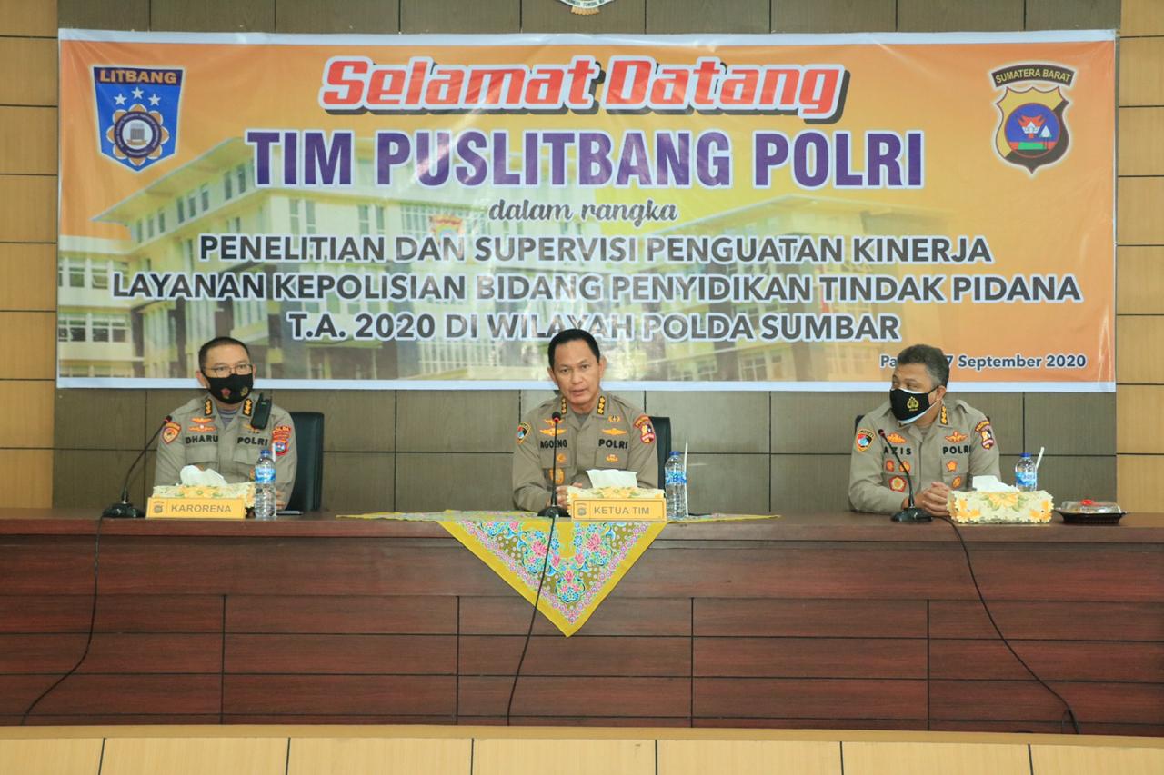 Selain penelitian, Tim Puslitbang Polri juga supervisi penguatan kinerja layanan kepolisian bidang Penyidikan Tindak Pidana untuk TA. 2020, Senin (7/9) di ruang Jendral Purn. Soekanto Lantai IV Mapolda Sumbar.