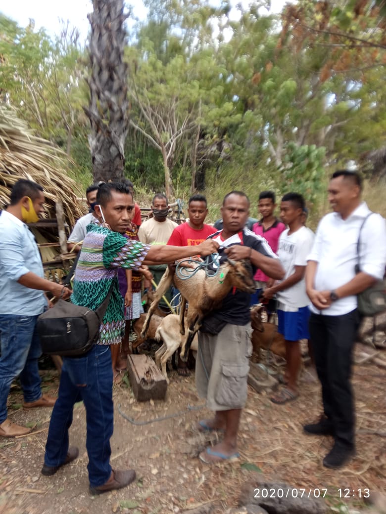 ROTE NDAO, mediapolisi.com – UPT Kesataun Pengelolaan Kehutanan Kabupaten Rote Ndao yang diwakili Zet Solok dan Pendamping Bangun Pesona Kehutanan Demsy Mbau Bersama Ketua Fraksi PDI Perjuangan Kabupaten Rote Ndao Denison Moy,ST dan Pj Kepala Desa Mundek Hery A Dano Serahkan Bantuan Kambing dari Kementerian Lingkungan Lingkungan Hidup Dan Kehutanan Republik Indonesia kepada Kelompok Tani Hutan Alenaul Desa Mumdek Kecamatan Rote Barat Laut yang ditandai dengan pemberian Tanda identitas di Telinga Kambing Bantuan tersebut, Selasa (07/07/2020).
